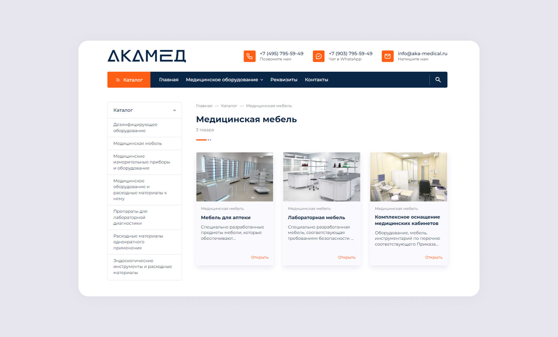 Создать сайт для компании «АКА-МЕД», занимающейся продажей медицинского оборудования и широкого ассортимента медицинских изделий.
