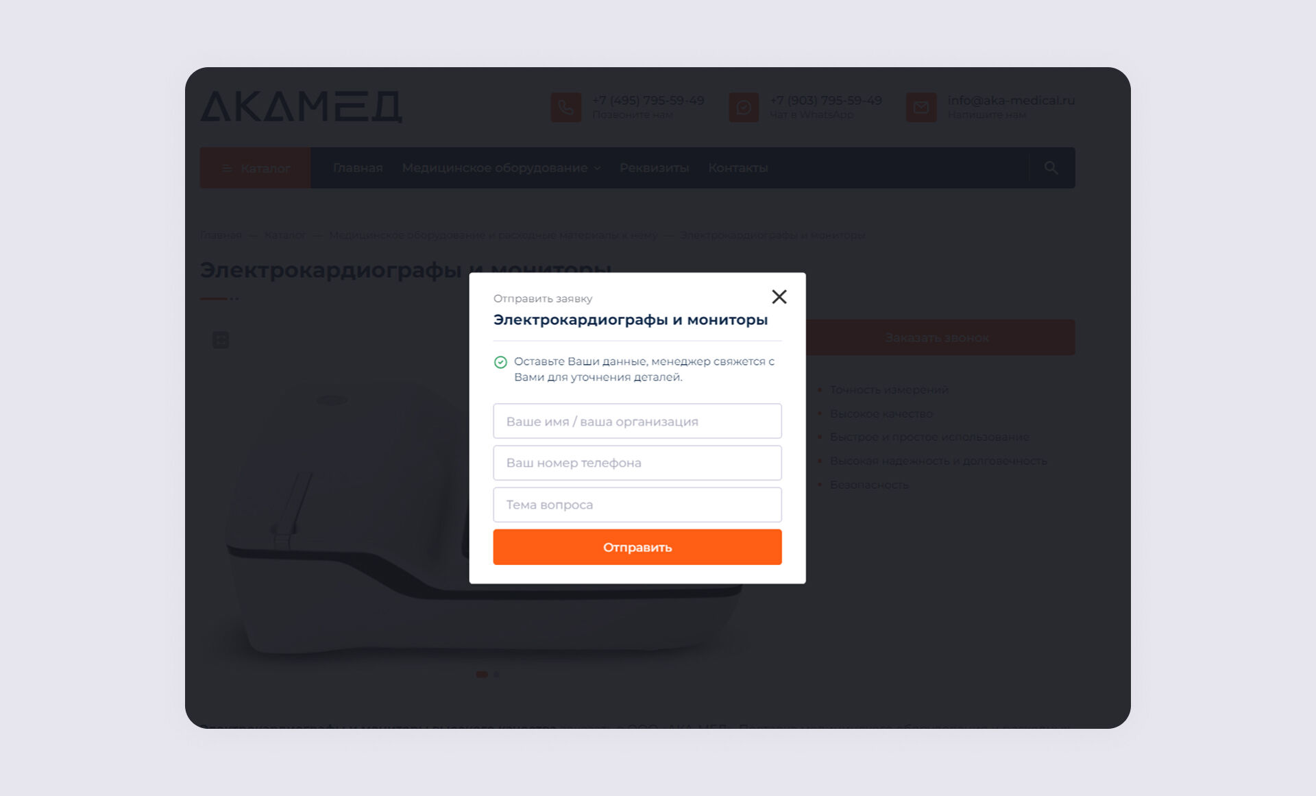 Основной задачей было создание интуитивно понятного и удобного сайта, который наглядно демонстрирует весь ассортимент продукции «АКА-МЕД». Мы разработали платформу, которая не только привлекает внимание пользователей, но и обеспечивает легкий доступ ко всей имеющейся информации. Сайт отражает уникальные характеристики и преимущества представленной на нём продукции, создает положительное впечатление и вовлекает.