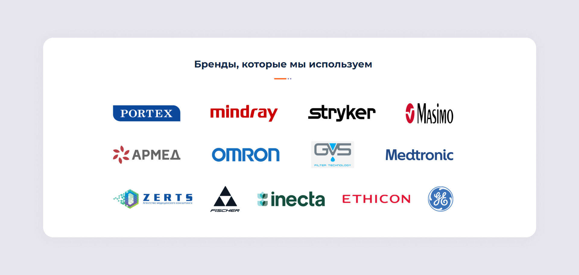 Далее на Главной странице разместили блок с брендами, с которыми сотрудничает и чьим дилером является «АКА-МЕД». Мы заострили внимание на том, что компания реализует действительно высококачественное оборудование известных мировых брендов и сотрудничает с проверенными поставщиками, что существенно повышает привлекательность сайта и компании в целом. Клиенты заинтересованы в приобретении товаров гарантированно высокого качества.
