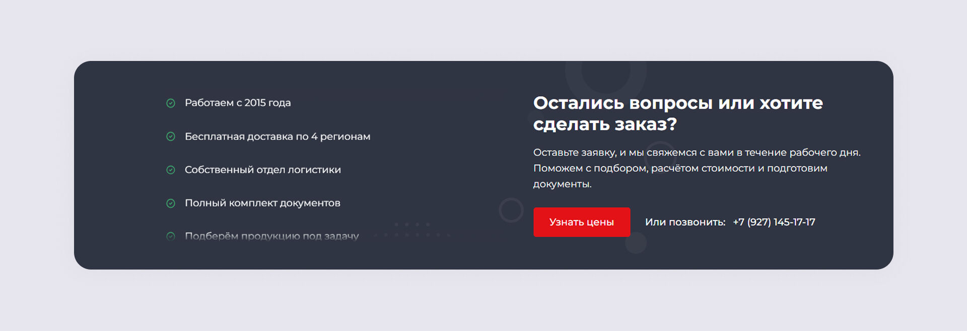 Первый блок сайта отражает основную информацию: бренды продукции и УТП с бесплатной доставкой по областям.