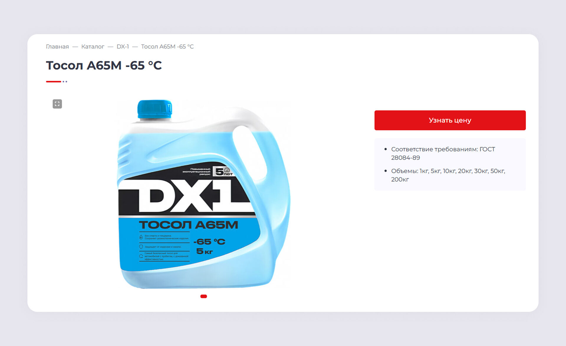 Карточка начинается с большой фотографии, соответствием ГОСТ и доступными объемами. Кнопка узнать цену открывает форму заявки: