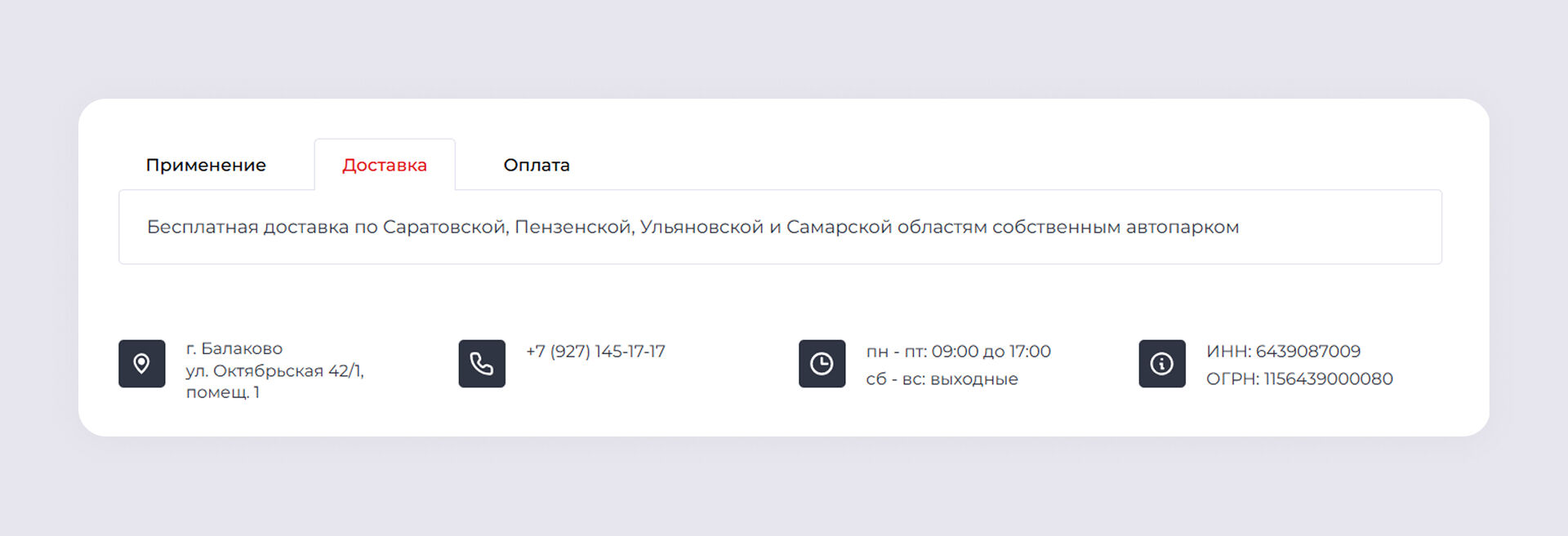 Завершает карточку дополнительная информация о доставке, оплате и применении и верхний блок подвала сайта: