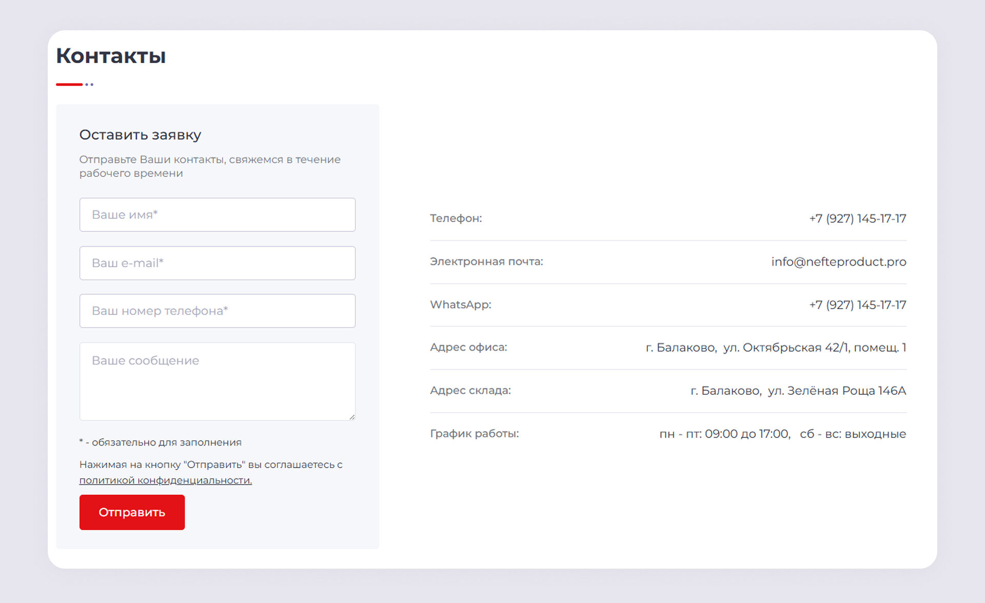 Страница «Контакты» содержит основные способы связи, также на эту страницу встроены карты расположения офиса и склада: