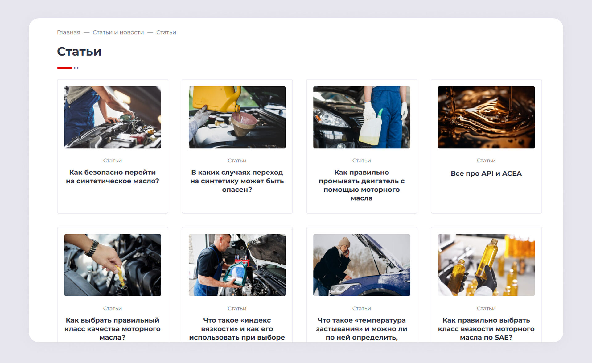 Страница «Статьи» используется не только для размещения полезной информации для посетителей, но и для SEO продвижения:
