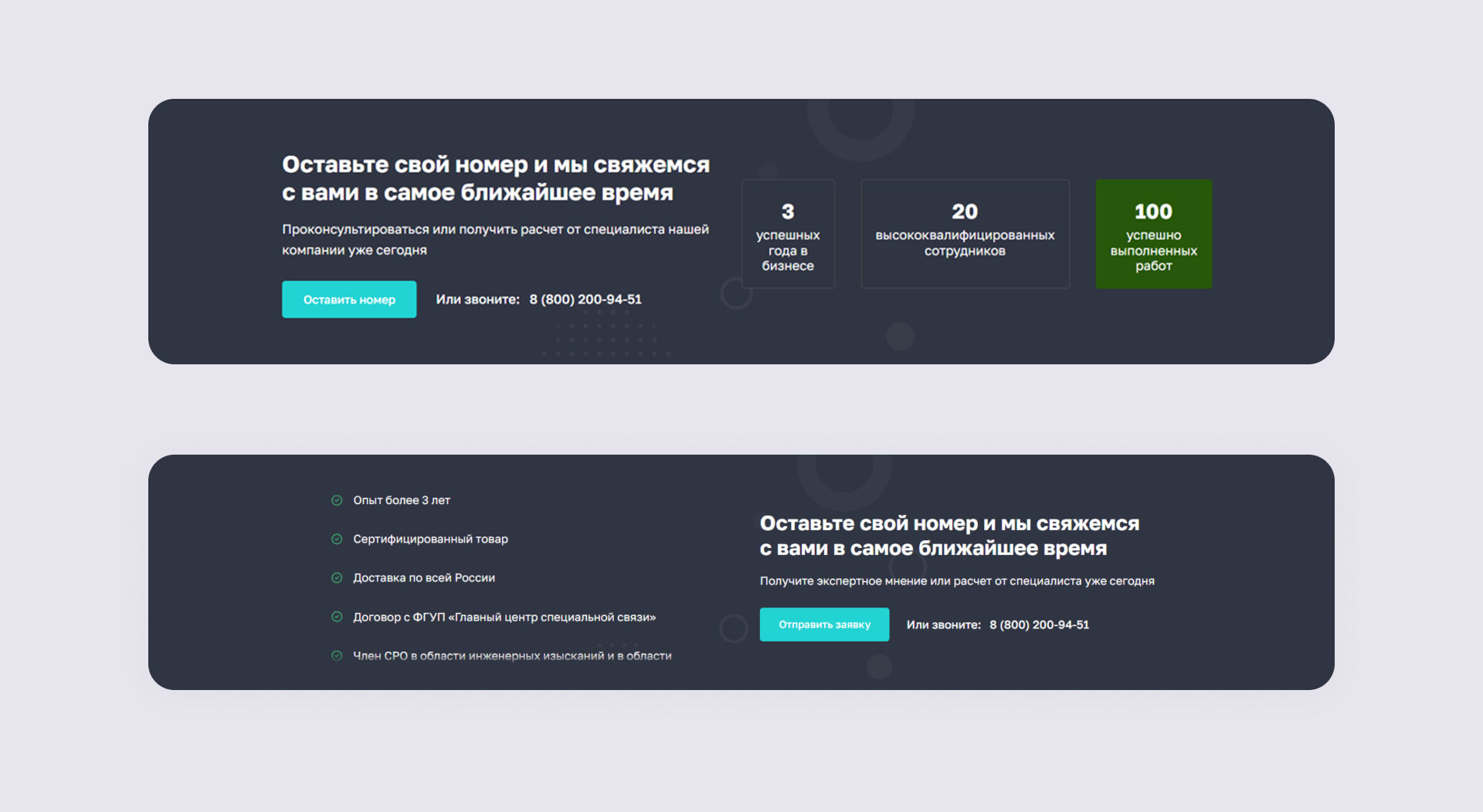 На главной странице сайта информационные блоки гармонично чередуются с призывами к действию. Это обеспечивает удобный доступ к контактной информации и упрощает процесс связи, оставаясь всегда на виду.