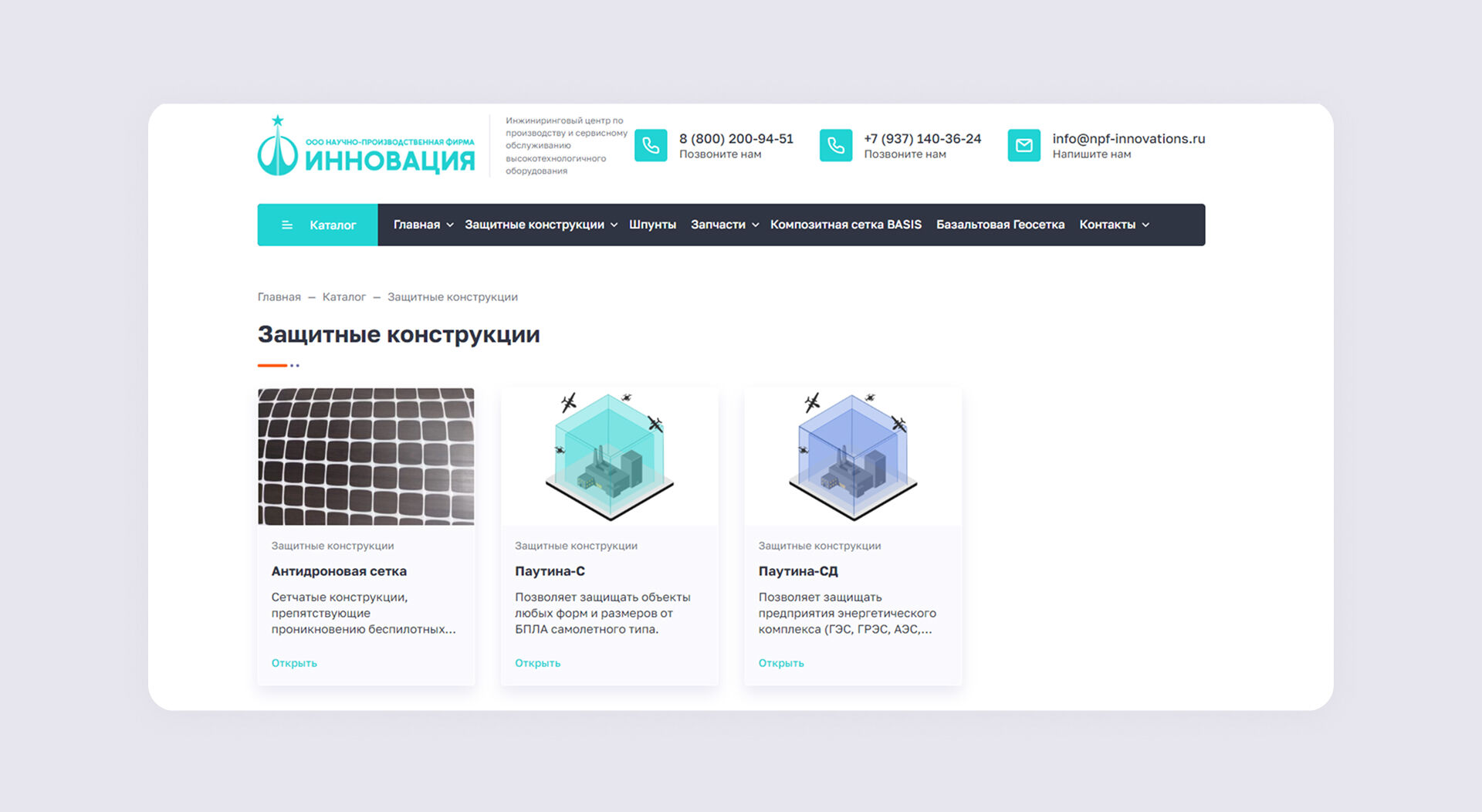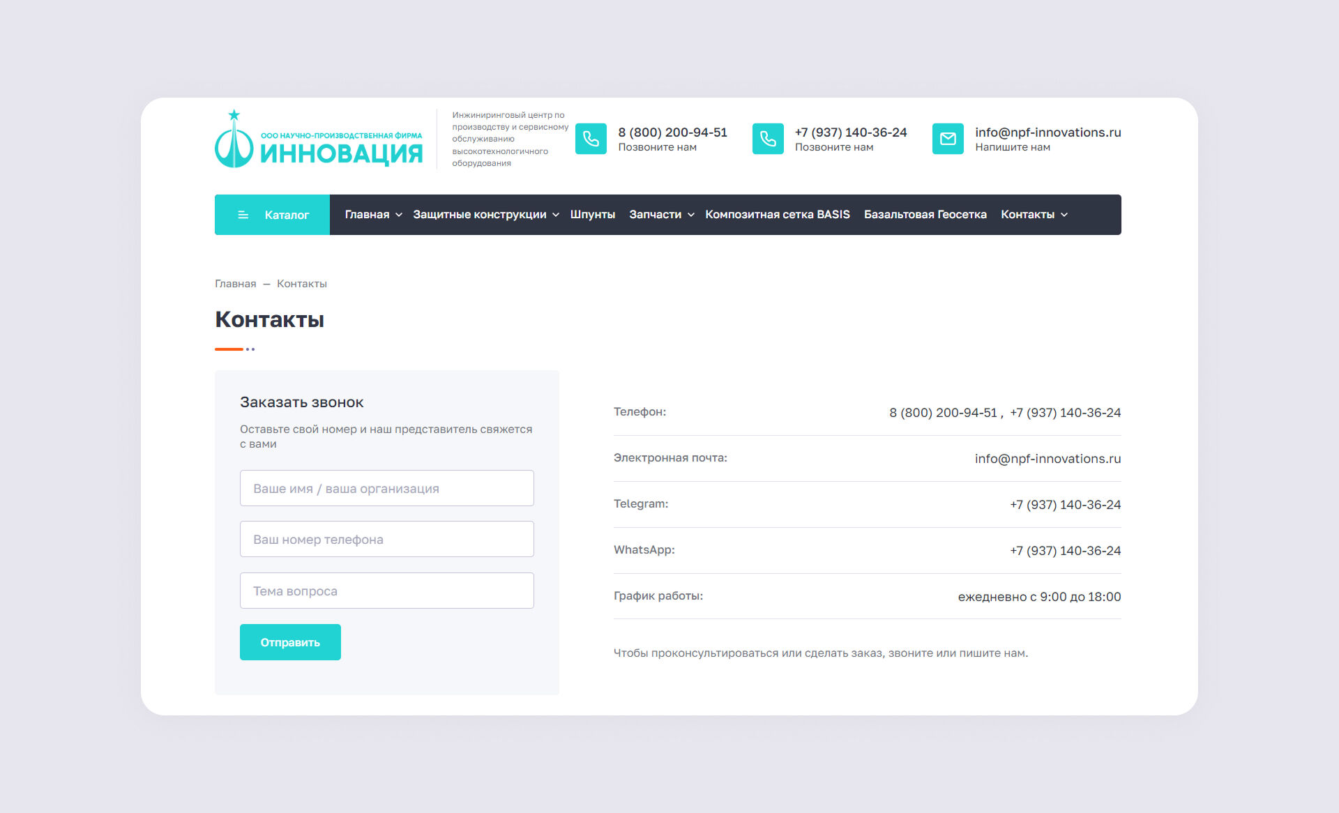 Основной целью проекта была разработка интуитивно понятного и удобного сайта, который наглядно демонстрирует возможности компании НПФ «Инновации». Мы стремились создать платформу, привлекающую внимание пользователей и обеспечивающую легкий доступ к информации о продукции и услугах центра.