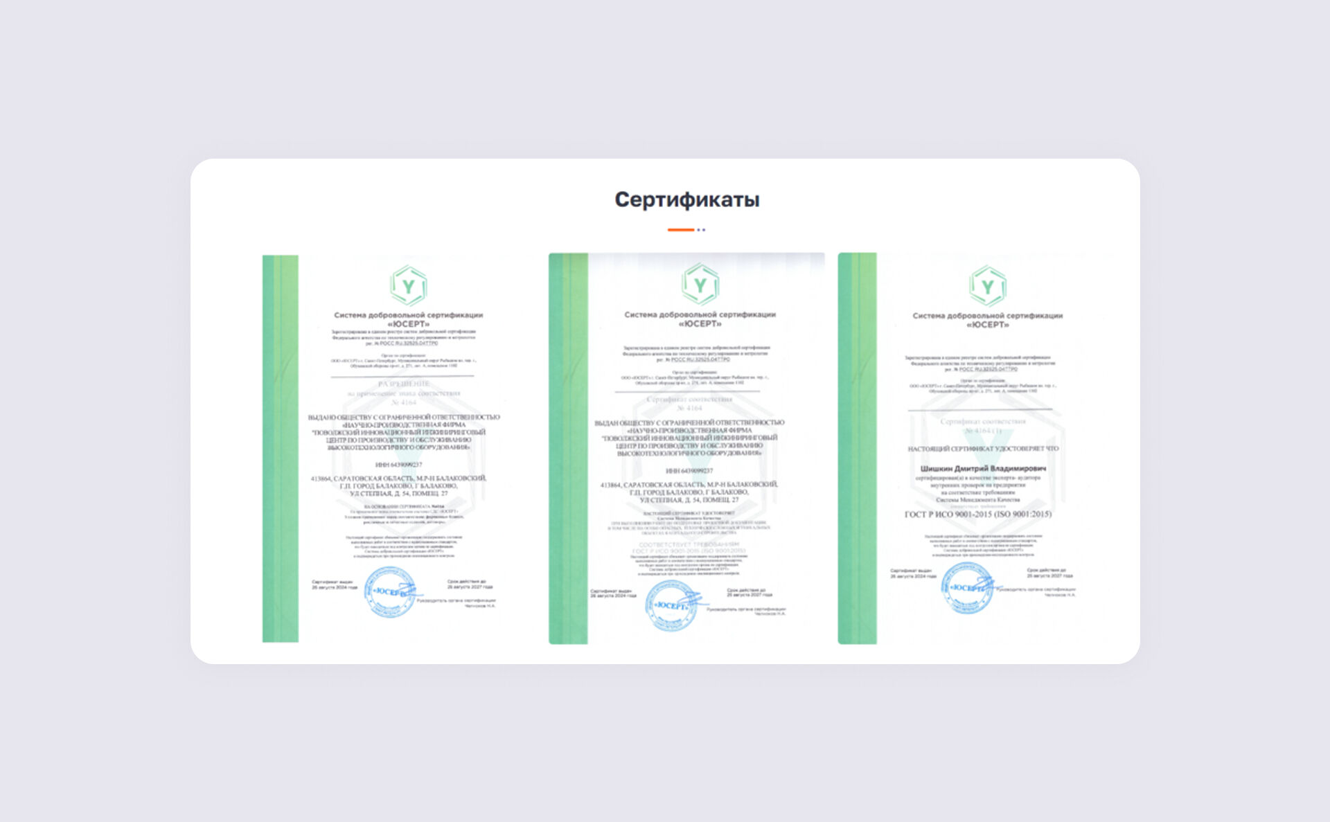 А чтобы усилить всё вышеперечисленное, также на сайте были размещены сертификаты и другие официальные документы, подтверждающие качество услуг и соответствие высоким стандартам. Это гарантия надежности и профессионализма, позволяющая клиентам чувствовать себя ещё более уверенно при выборе компании.