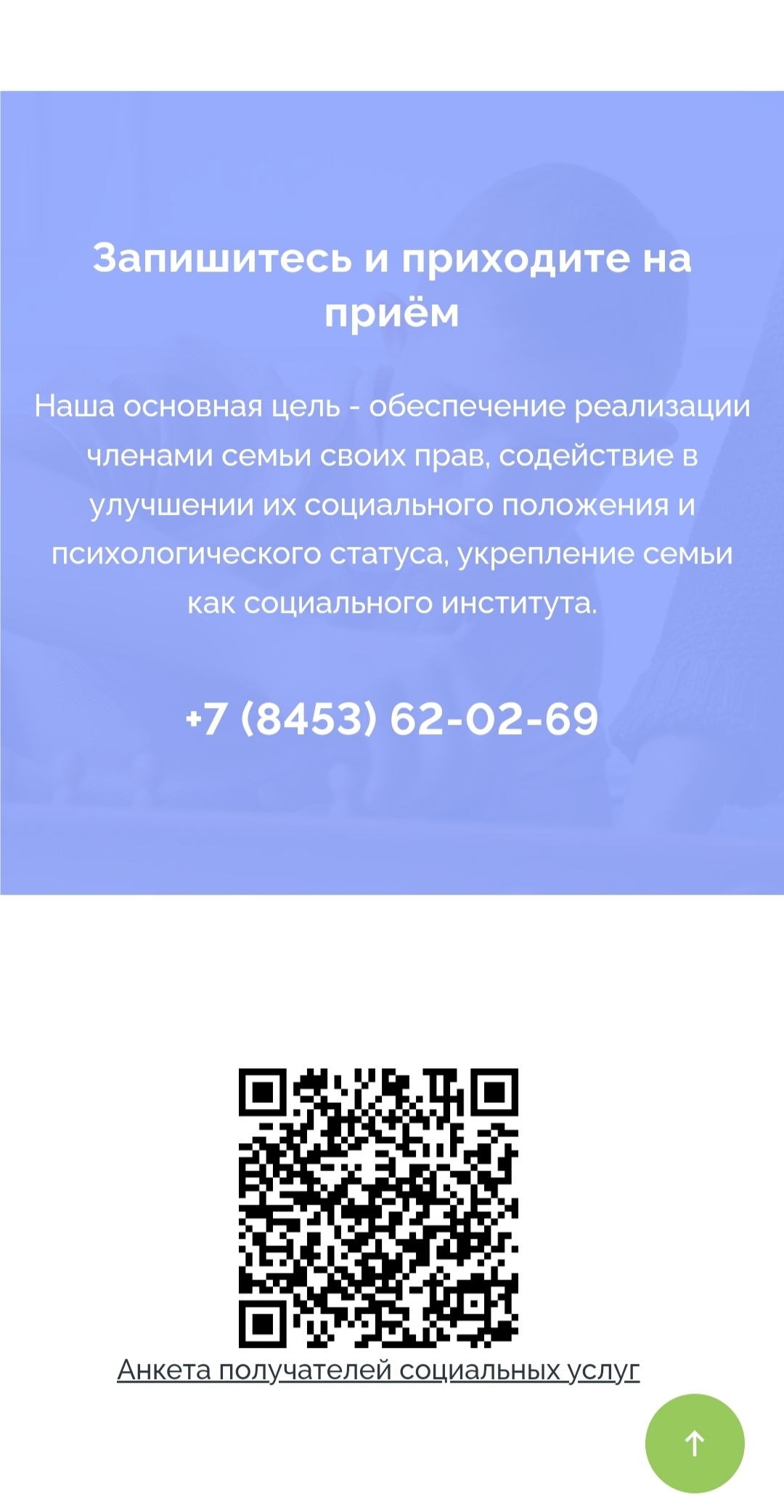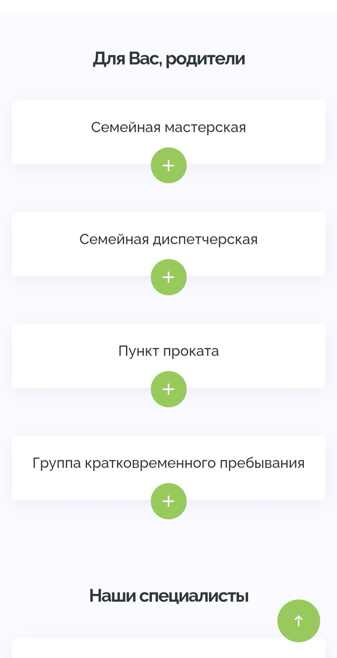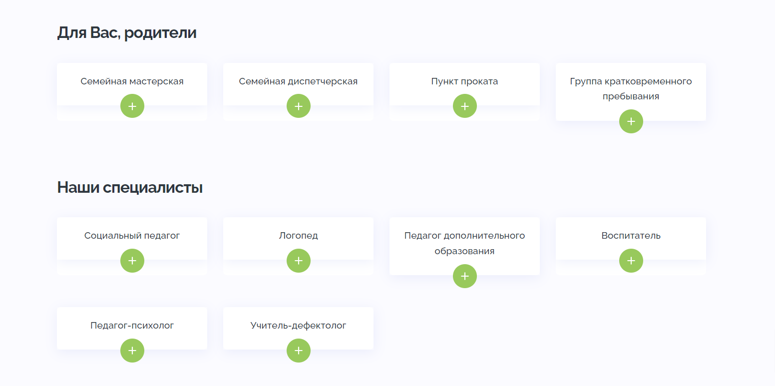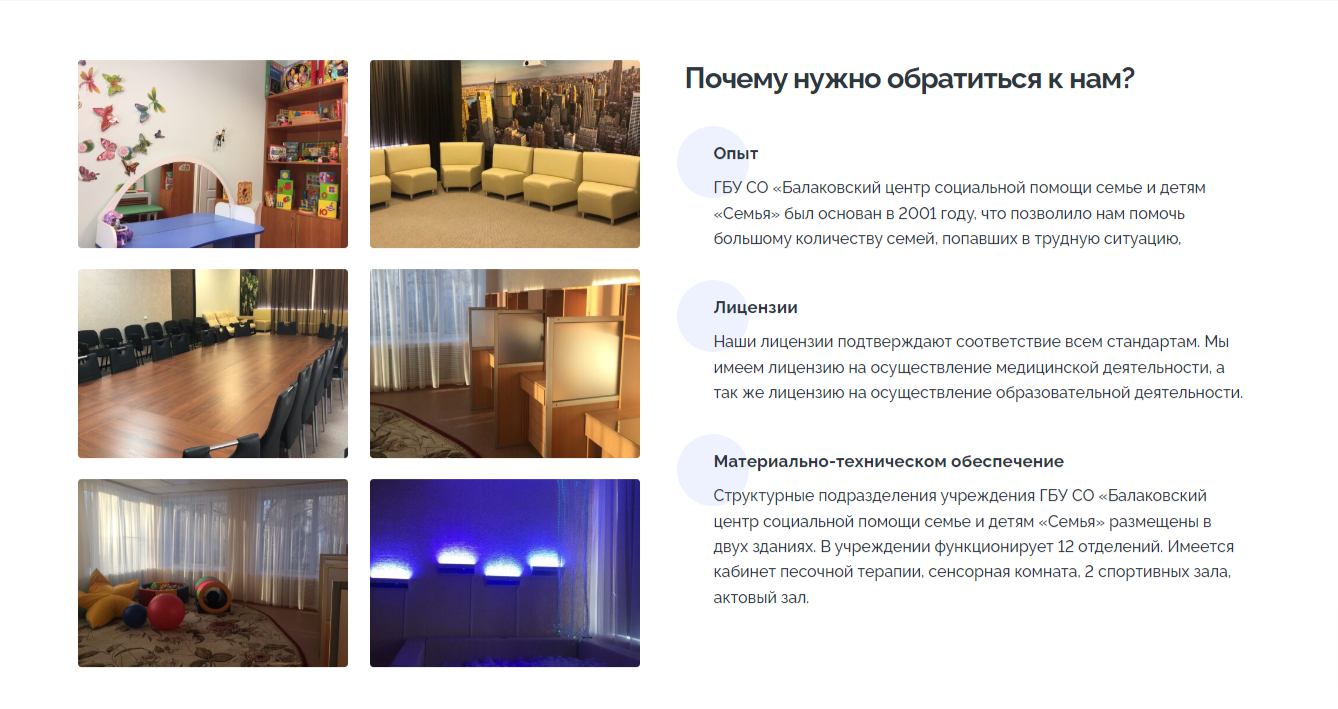 Ещё на главной странице мы разместили раздел, посвященный преимуществам центра «Семья». Этот информационный блок позволяет пользователям детальнее ознакомиться с Центром.