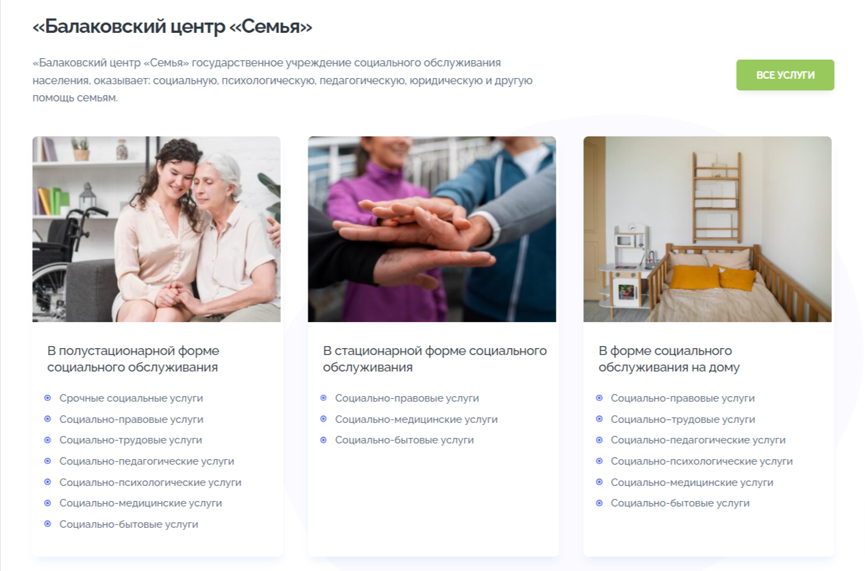 Во время подготовки к разработке сайта и выбору макета мы провели анализ перечня услуг, предлагаемых «Балаковским центром «Семья». Это дало полное представление о работе центра.