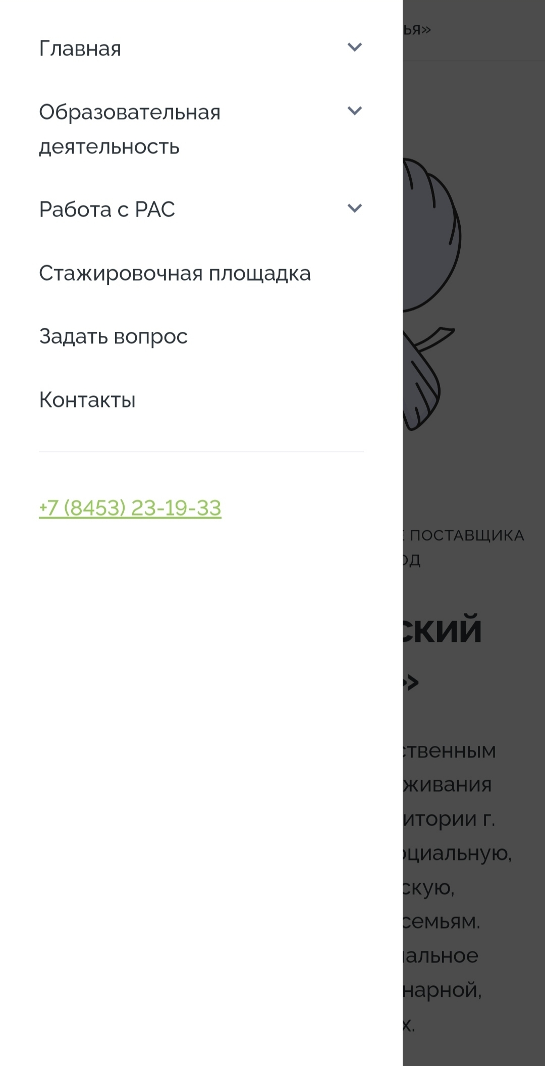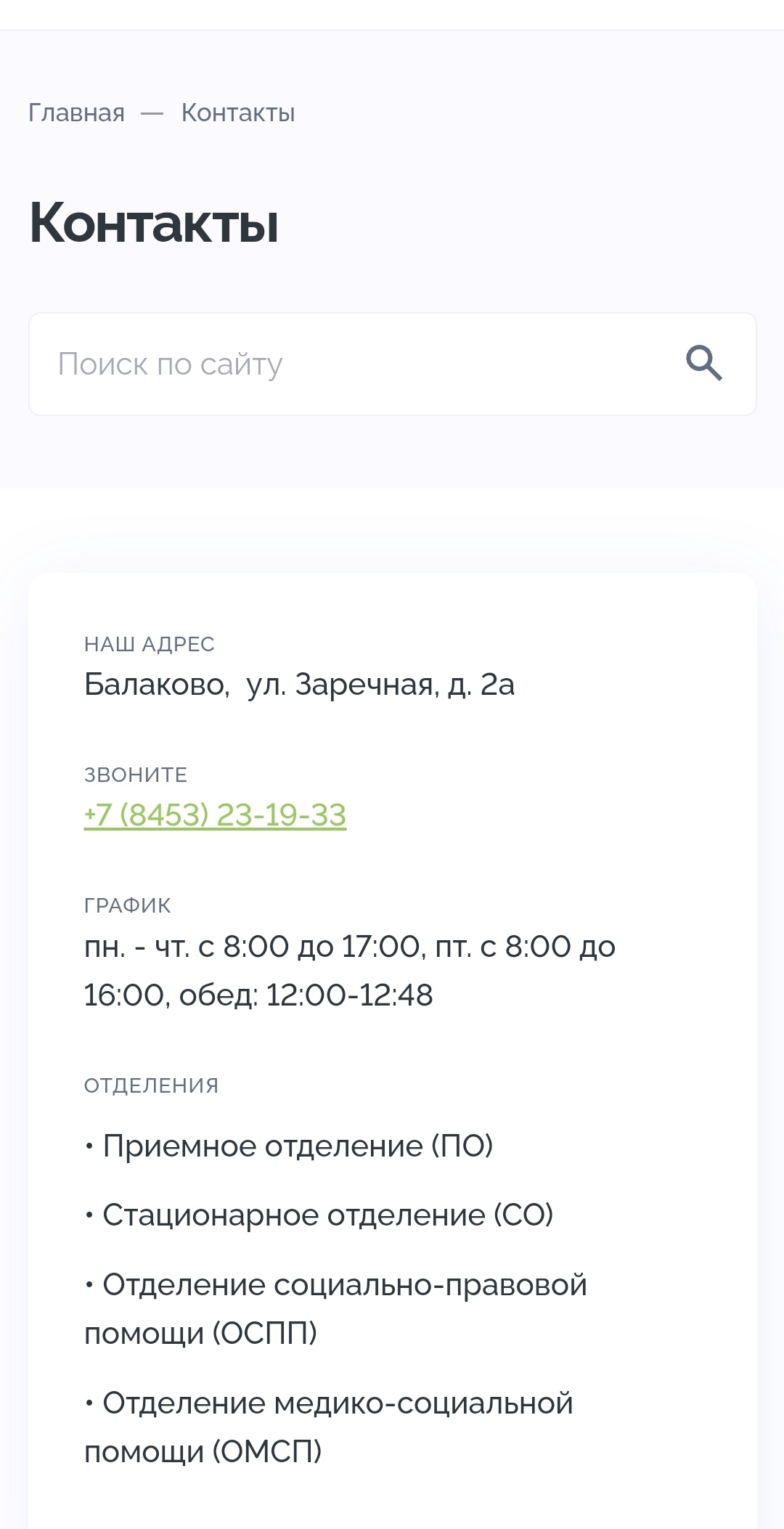На главной странице пользователя встречает краткая и понятная информация о Центре, его основные услуги и преимущества. Также предусмотрена удобная кнопка для перехода на страницу «Контакты», где можно найти актуальные данные для связи, адрес и режим работы. Это даёт быстрый доступ к необходимой информации и упрощает взаимодействие.