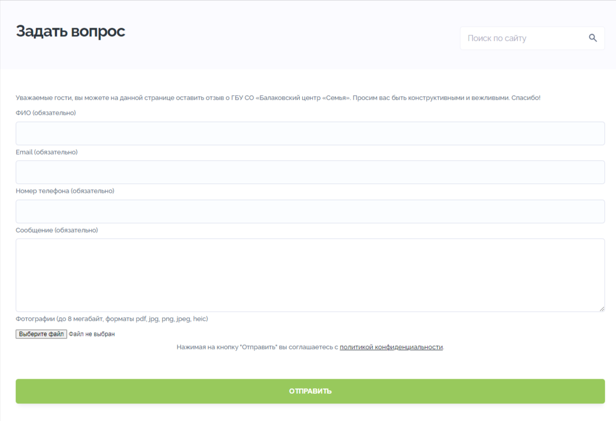 Для упрощения процесса поиска необходимой информации на сайт также была добавлена удобная контактная форма с возможностью задать любой интересующий вопрос.