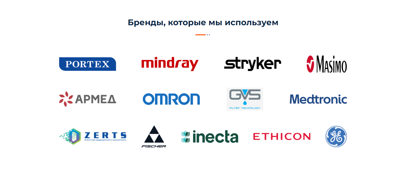Далее на Главной странице разместили блок с брендами, с которыми сотрудничает и чьим дилером является «АКА-МЕД». Мы заострили внимание на том, что компания реализует действительно высококачественное оборудование известных мировых брендов и сотрудничает с проверенными поставщиками, что существенно повышает привлекательность сайта и компании в целом. Клиенты заинтересованы в приобретении товаров гарантированно высокого качества.