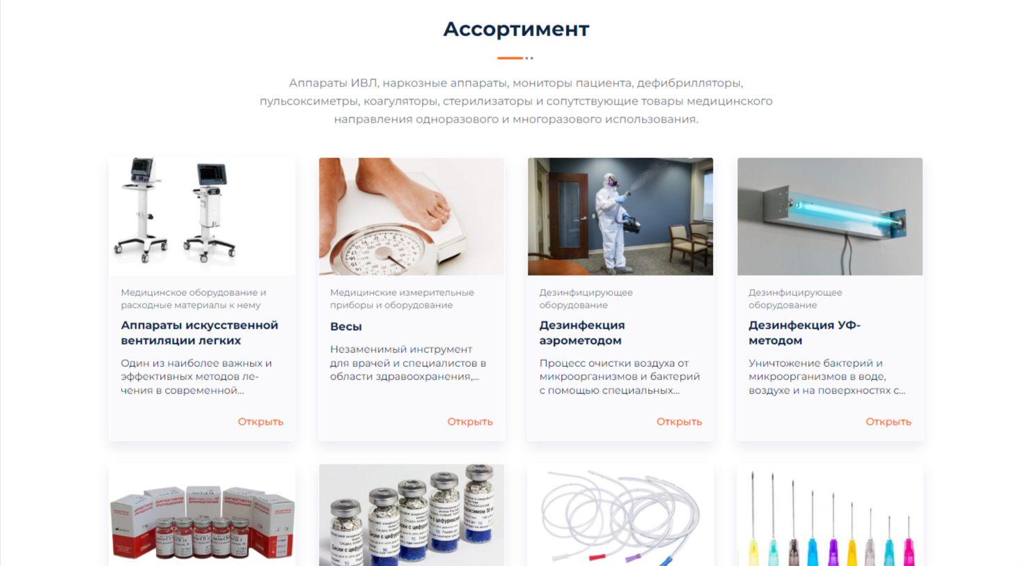 Чтобы максимально полно представить все товары, на Главной странице сайта также был введен раздел Ассортимент. Это позволяет пользователю ещё более подробно ознакомиться с разнообразием предлагаемой продукции в одном месте.
