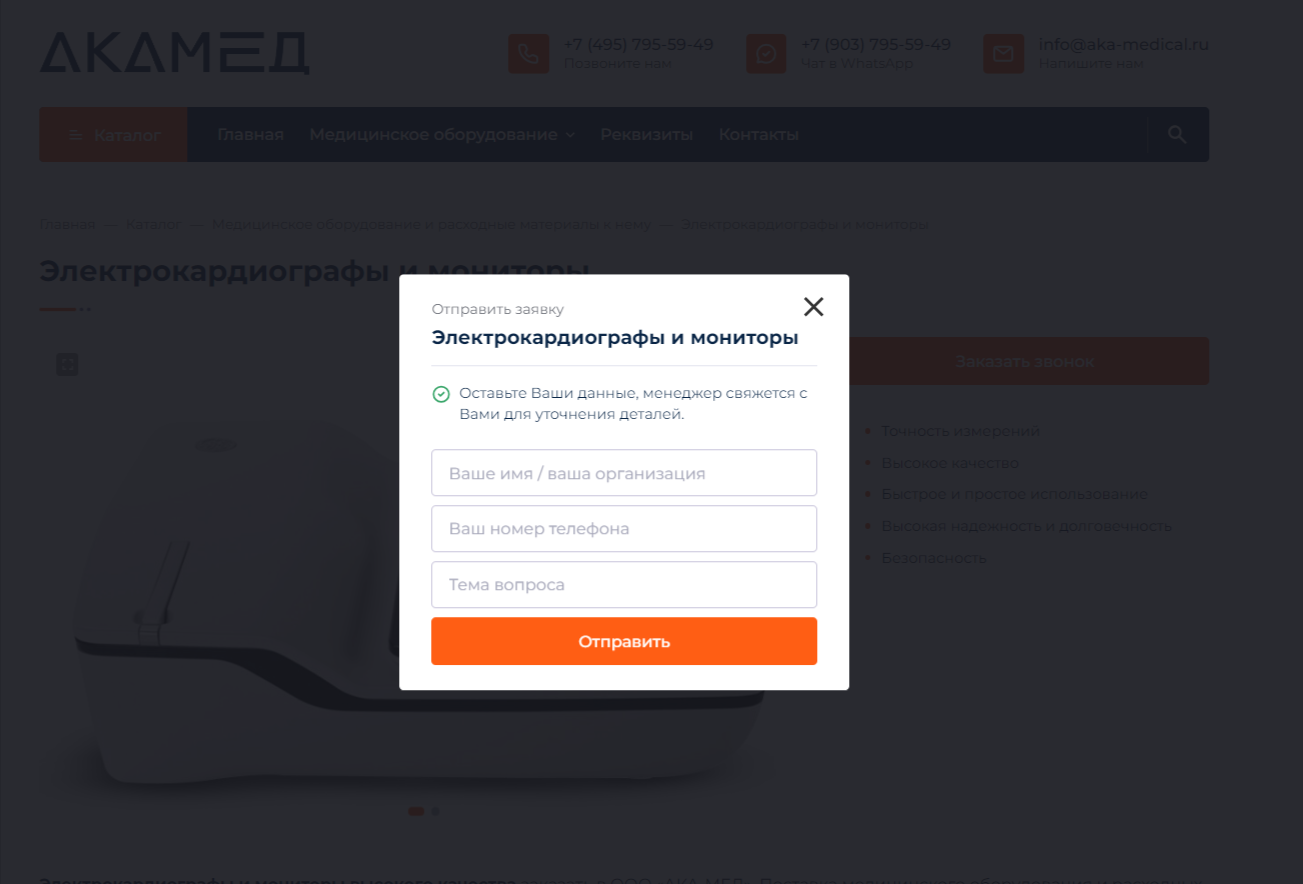 Основной задачей было создание интуитивно понятного и удобного сайта, который наглядно демонстрирует весь ассортимент продукции «АКА-МЕД». Мы разработали платформу, которая не только привлекает внимание пользователей, но и обеспечивает легкий доступ ко всей имеющейся информации. Сайт отражает уникальные характеристики и преимущества представленной на нём продукции, создает положительное впечатление и вовлекает.