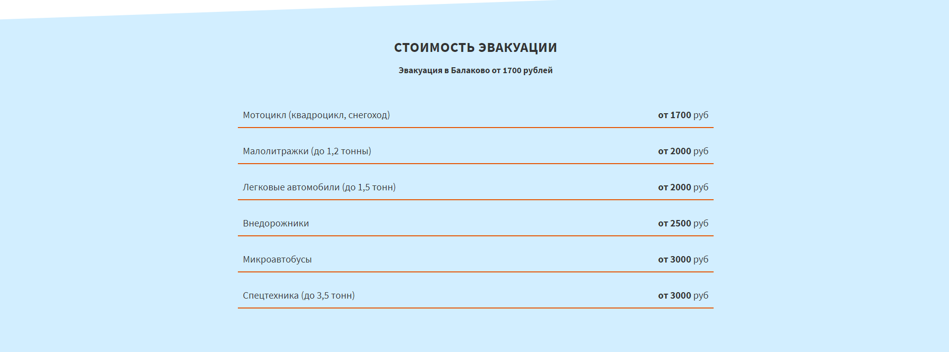 Для удобства пользователей мы создали блок с ценами. В блоке «Стоимость эвакуации» размещена полная информация о ценах на эвакуацию различных видов транспорта.
