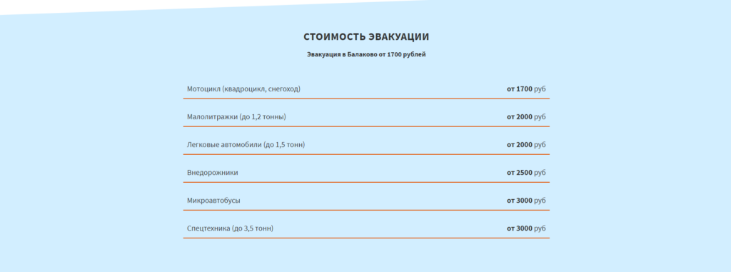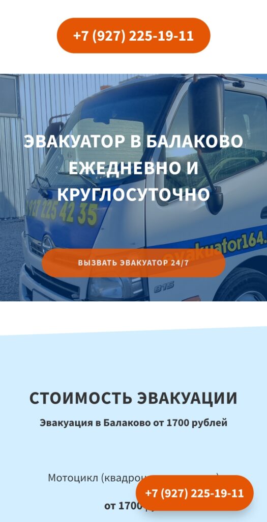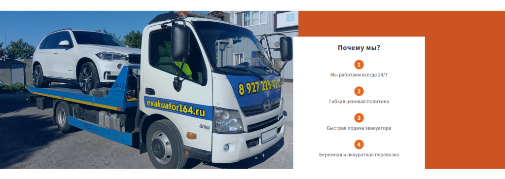В процессе подготовки контента и выбора макета провели анализ услуг, предлагаемых компанией. Собрали информацию о том, кто доверяет и прибегает к помощи «Эвакуатор Балаково».
