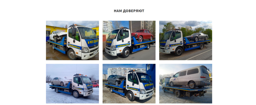 В дополнение ко всему перечисленному мы добавили блок с галереей фотографий в процессе работы. Таким образом пользователь наглядно видит разнообразие успешно эвакуированных автомобилей и убеждается в профессионализме и надежности компании.