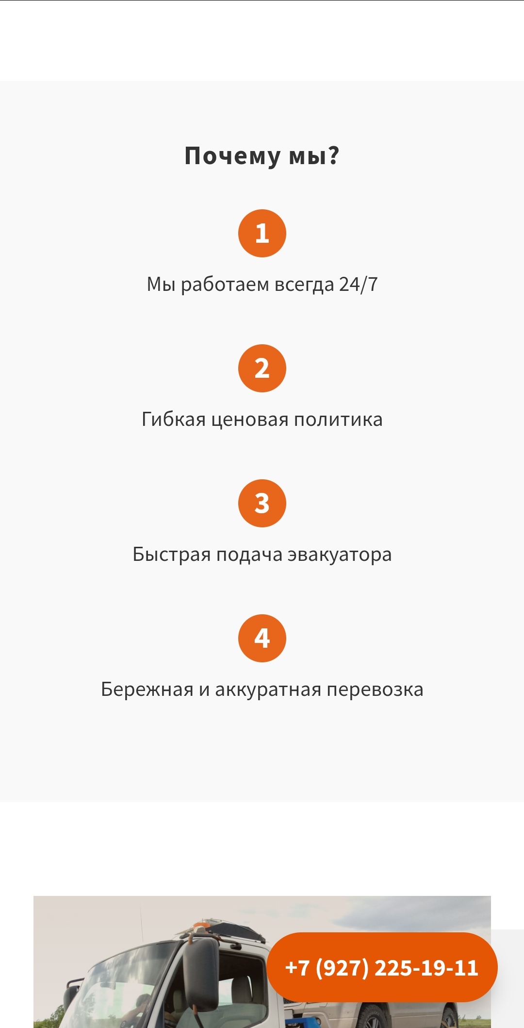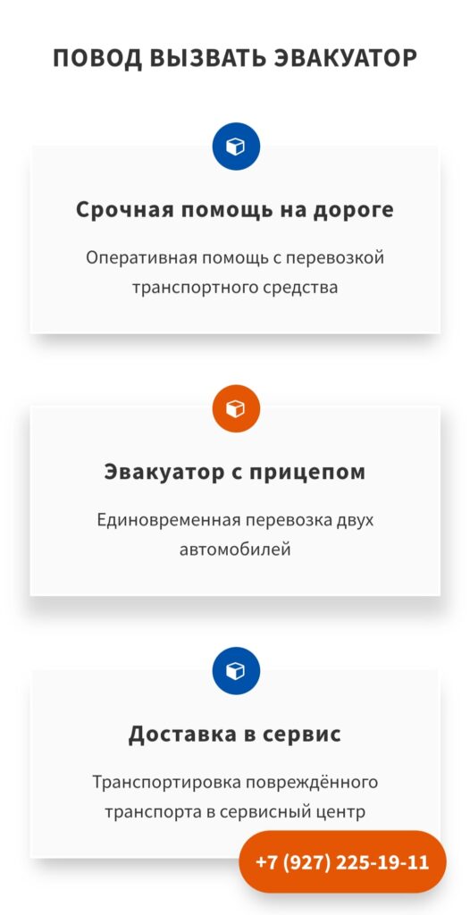 Так же на главной странице разместили блок с основными причинами для вызова эвакуатора. Он нужен, чтобы помогать людям в разных ситуациях быстрее и проще ориентироваться и получать своевременную помощь.