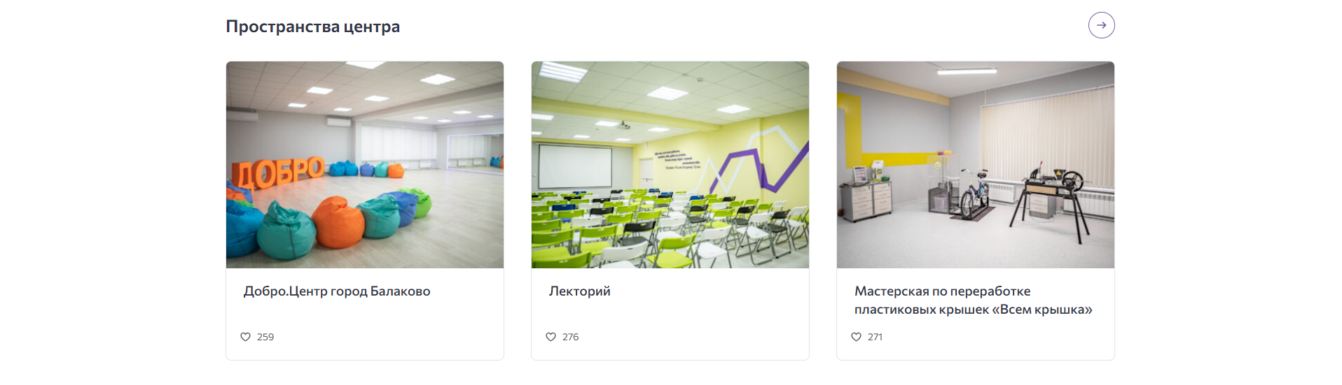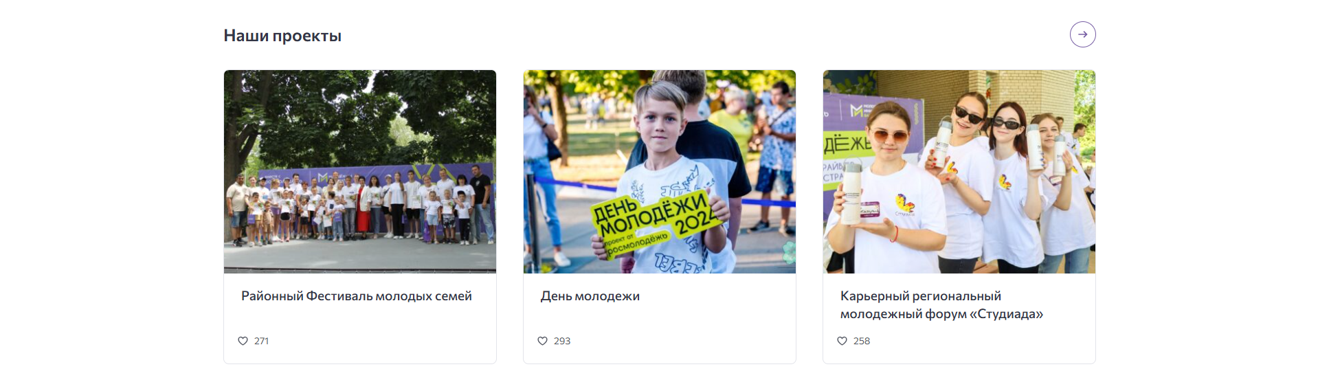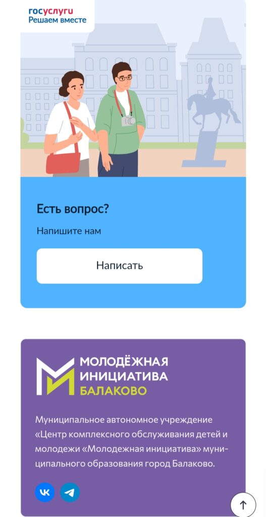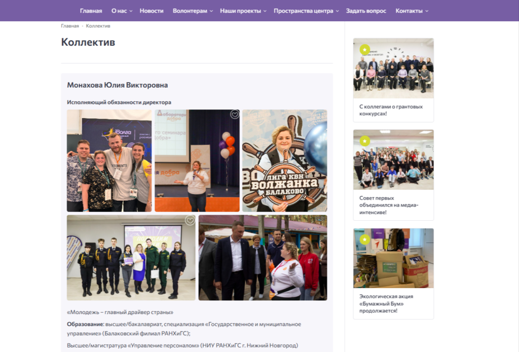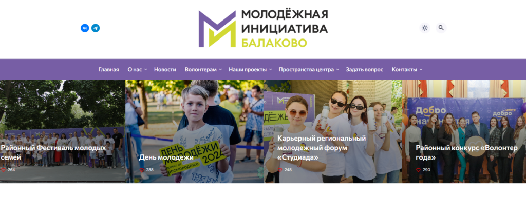 Далее были размещены такие блоки, как: «Наши проекты», «Волонтёрам», «Пространства центра». Эти разделы предоставляют пользователям доступ к важной информации о реализуемых проектах «Молодежной инициативы».