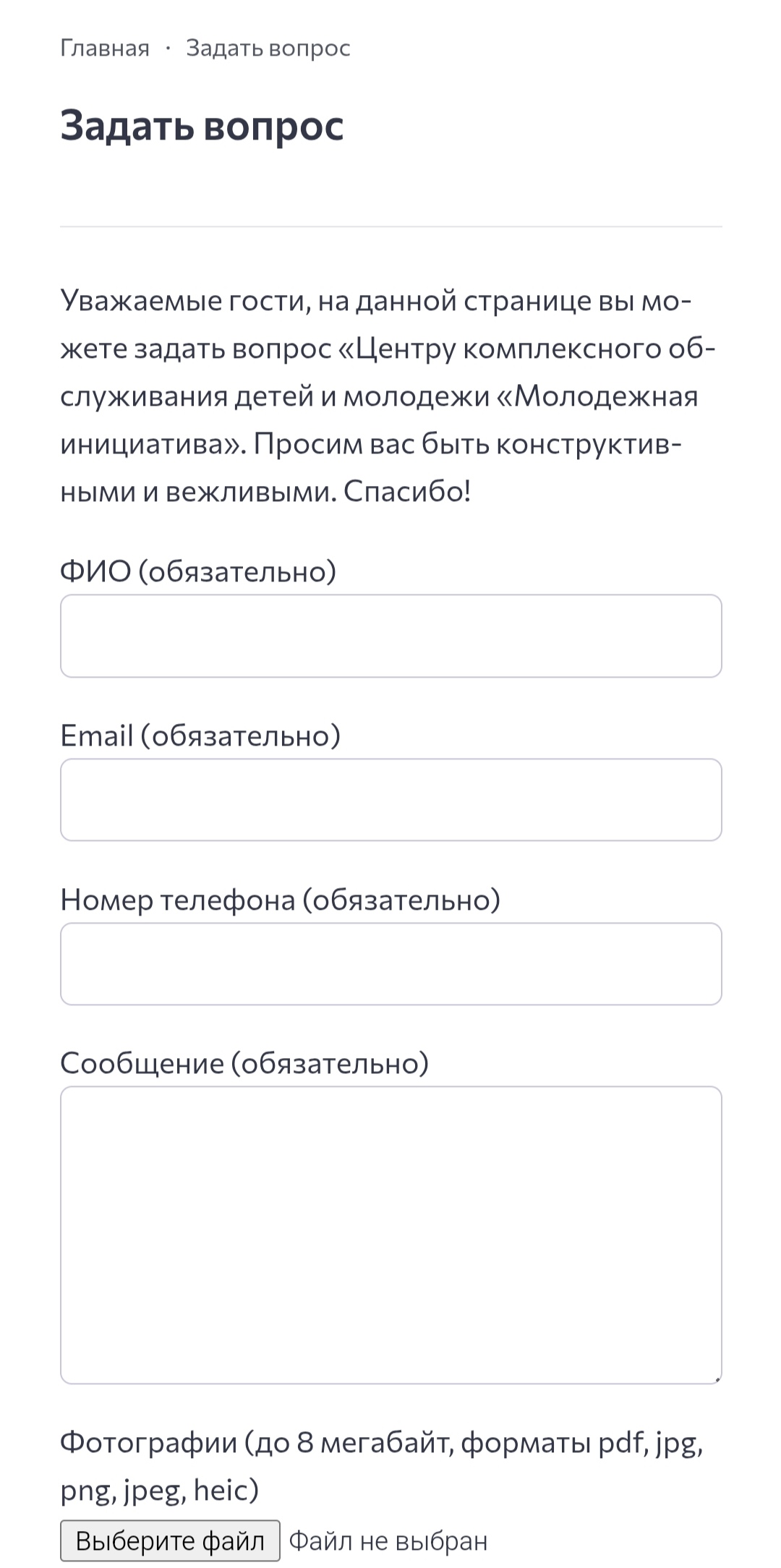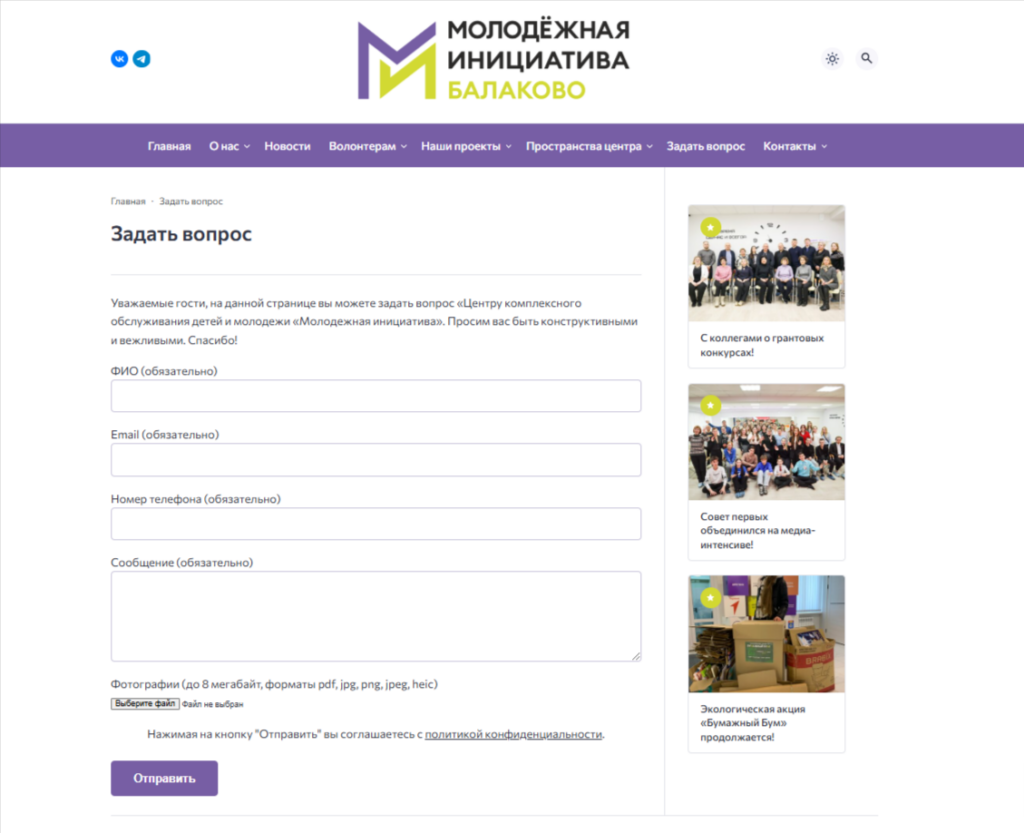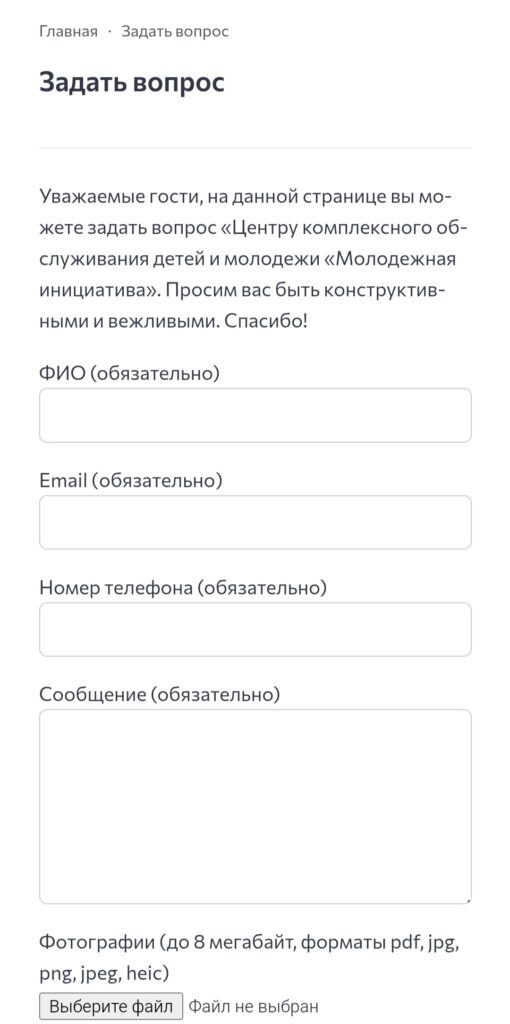 Страница «Задать вопрос» создана с целью предоставления пользователям удобной возможности задать интересующий их вопрос. Форма обратной связи содержит несколько полей для ввода информации и дает возможность делиться как впечатлениями, так и предложениями. Также предусмотрена опция прикрепления фотографий.