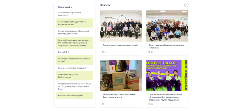 На главной странице разместили блок с новостями. В этом разделе пользователи могут ознакомиться с актуальными статьями, анонсами предстоящих событий и важными объявлениями.