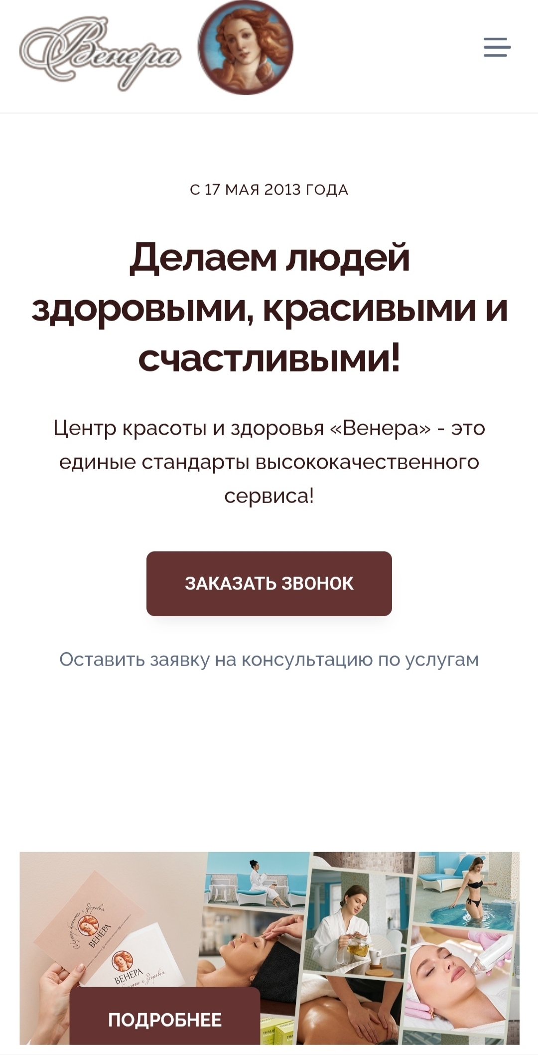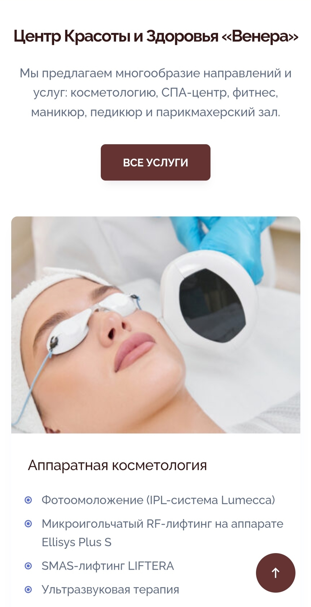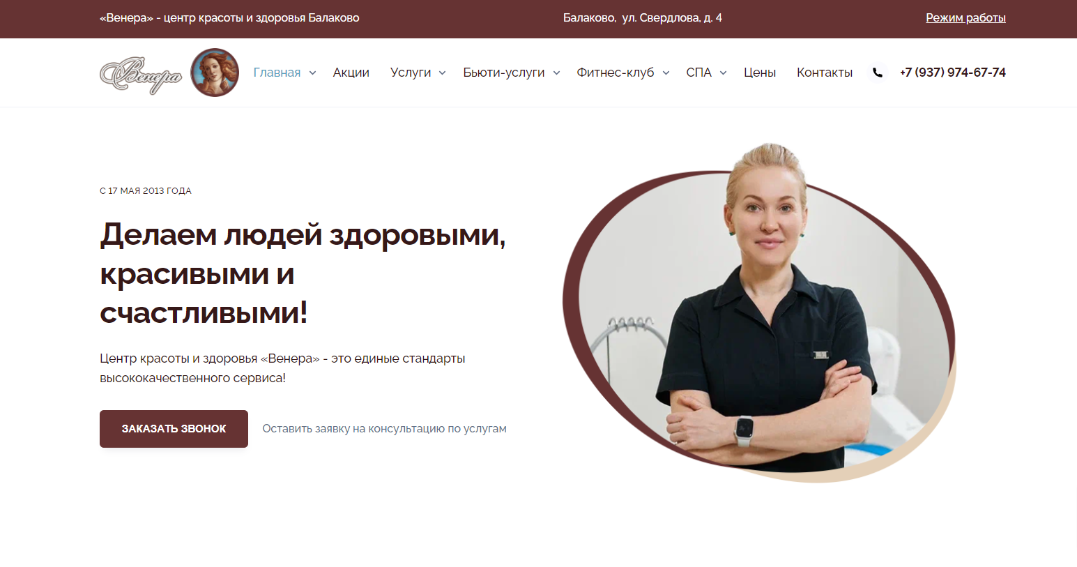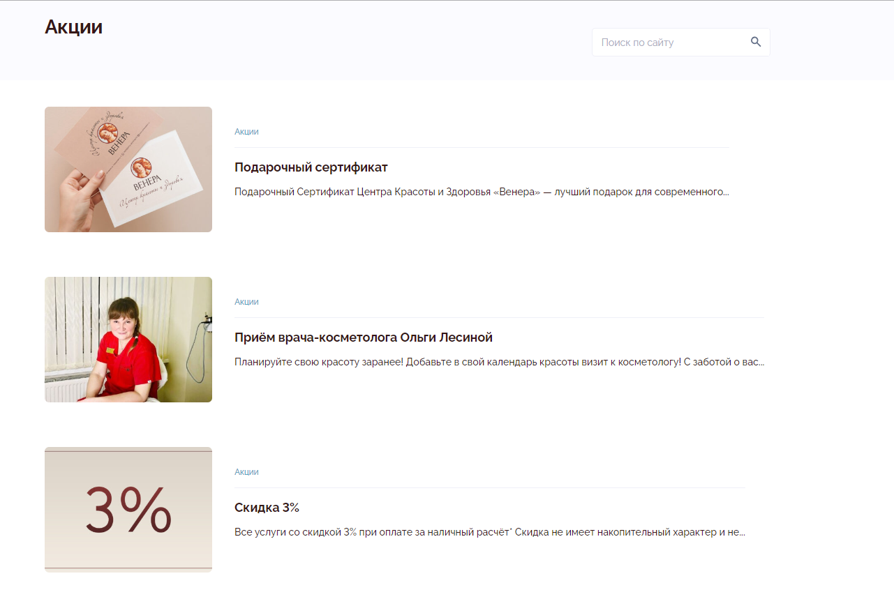 Основной целью создания сайта для Центра красоты и здоровья «Венера» было предоставление пользователям удобной площадки с наиболее полной информацией о предлагаемых услугах, их стоимости, действующих акциях и возможности записаться на процедуры.