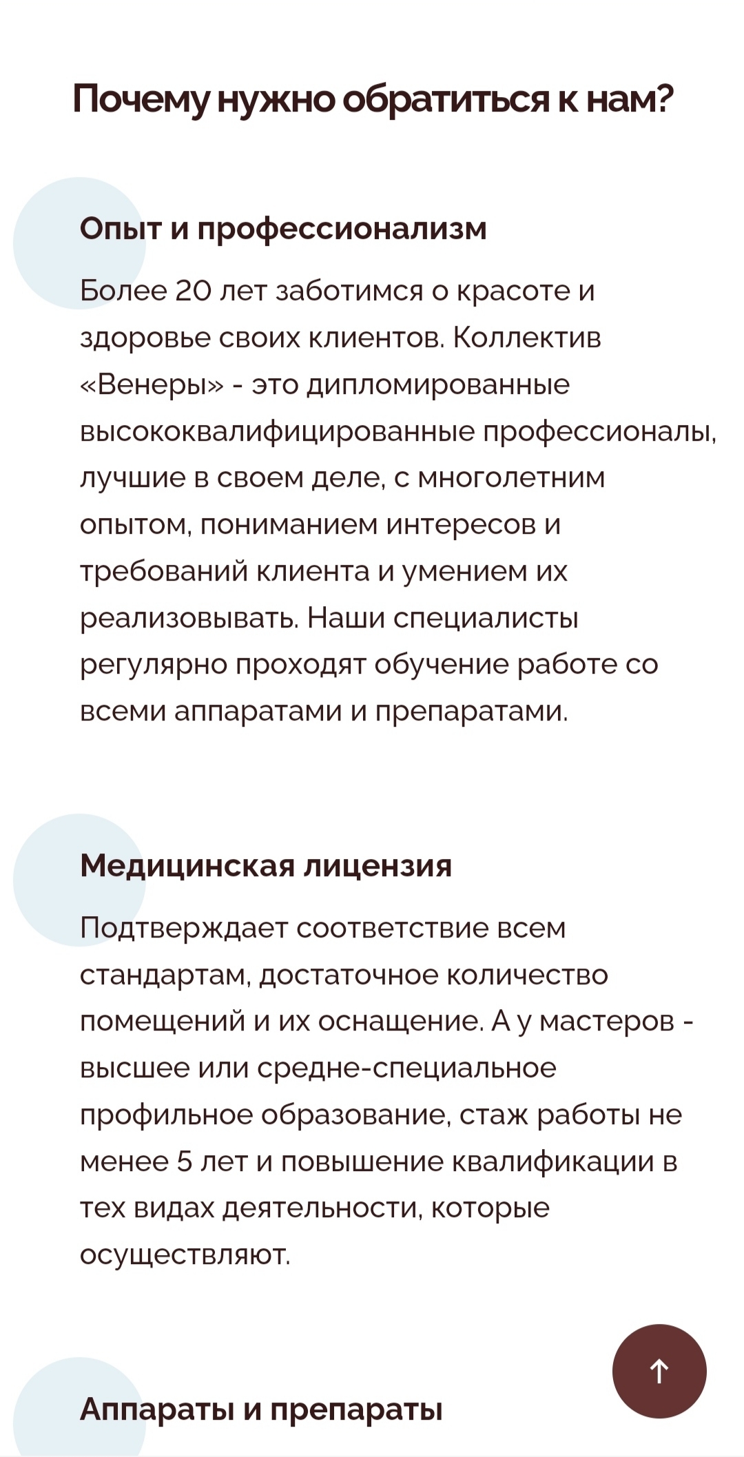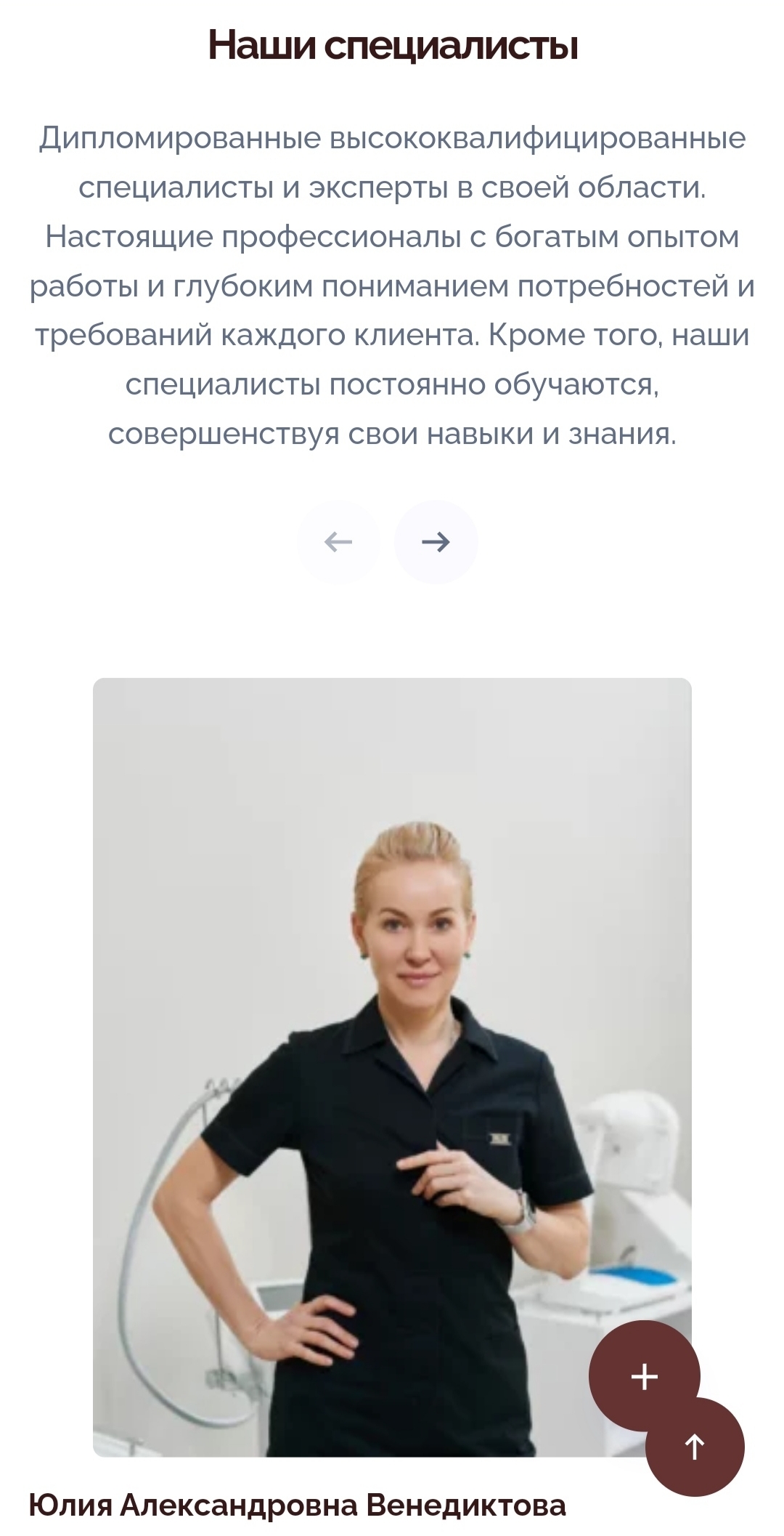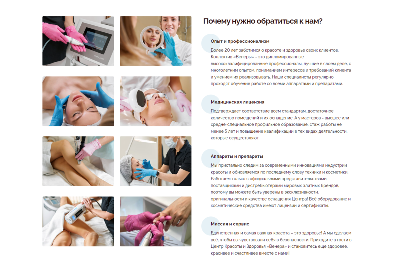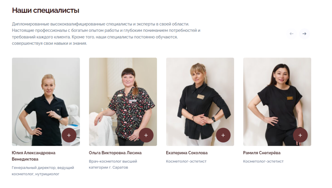 Кроме того, важным аспектом при выборе центра является квалификация и опыт специалистов, которые там работают. Мы добавили блок специалистов, где представили всех работников «Венеры» с указанием их специализации или должности. Данная информация помогает потенциальным клиентам оценить уровень профессионализма команды и выбрать те или иные услуги, зная, что они попадут в руки опытных мастеров.