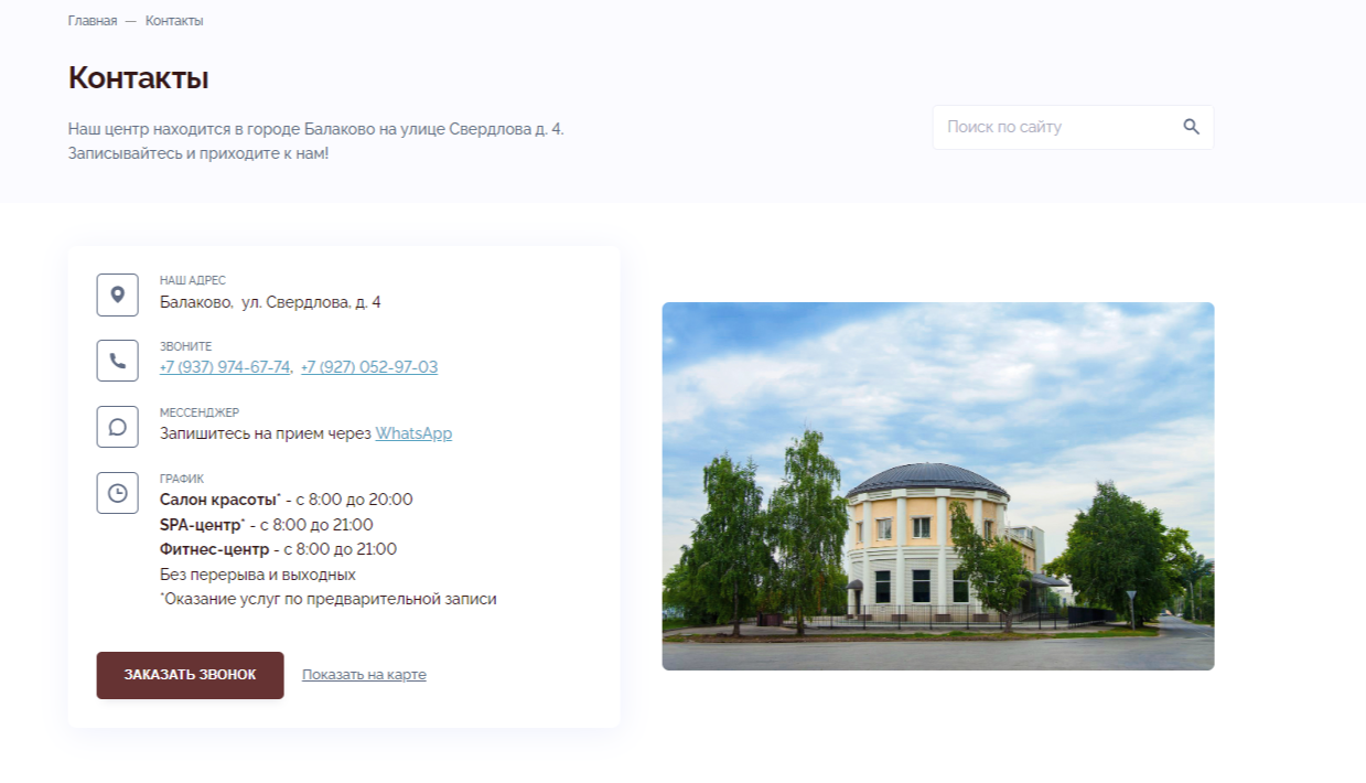 Немаловажной является и вкладка «Контакты», которая предоставляет пользователям наиболее полную информацию о номерах телефонов подразделений, адресе и режиме работы. Также на этой странице есть возможность просмотреть расположение центра на карте, что значительно облегчает навигацию для посетителей. Дополнительно размещена форма заказа звонка.