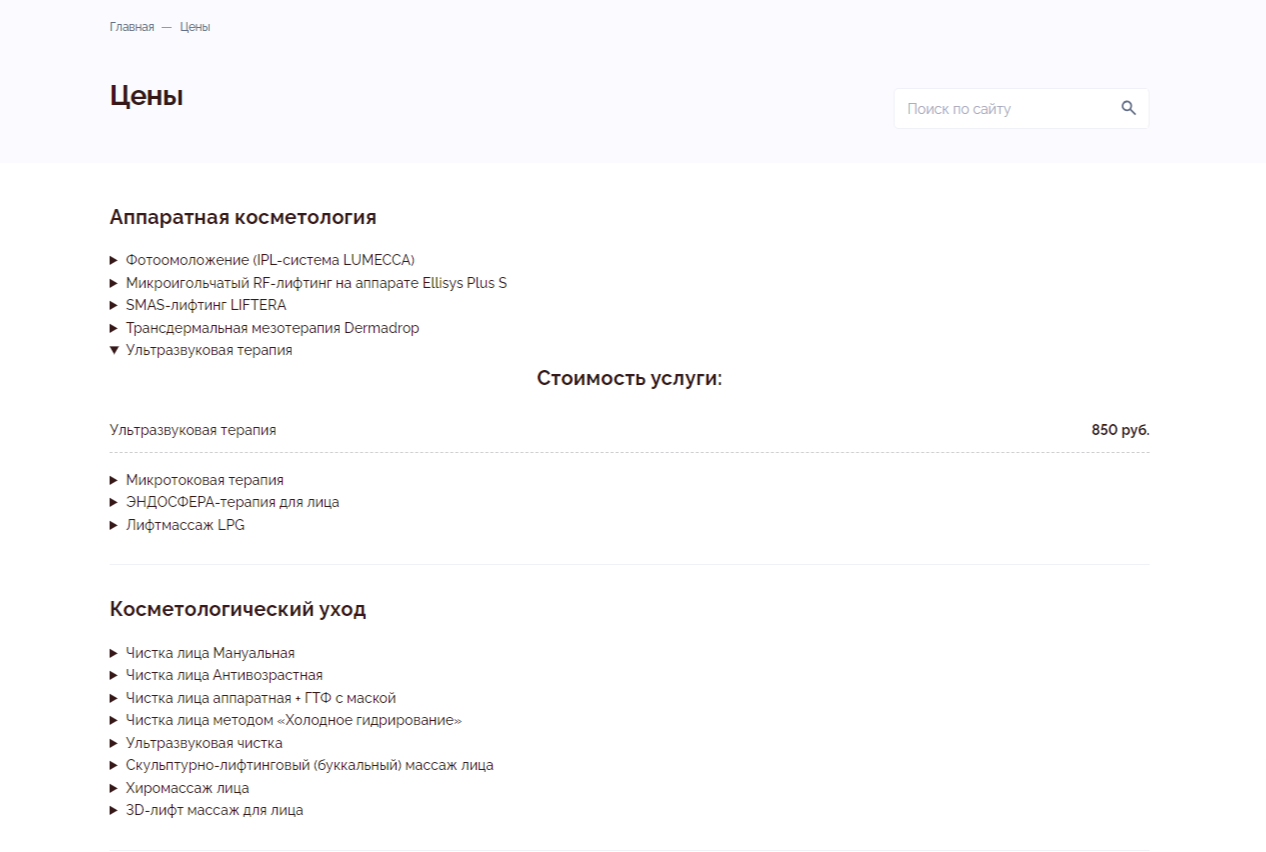 Полный перечень услуг с указанием цен на них разместили в отдельную вкладку «Цены». По статистике это один из наиболее посещаемых и интересующих пользователя блоков, который обязательно должен быть на сайте. На сайте «Венеры» данный список представлен в удобном формате, включающем выпадающие подсписки, что позволяет пользователям легко находить необходимую информацию и быстро ориентироваться в предложениях.