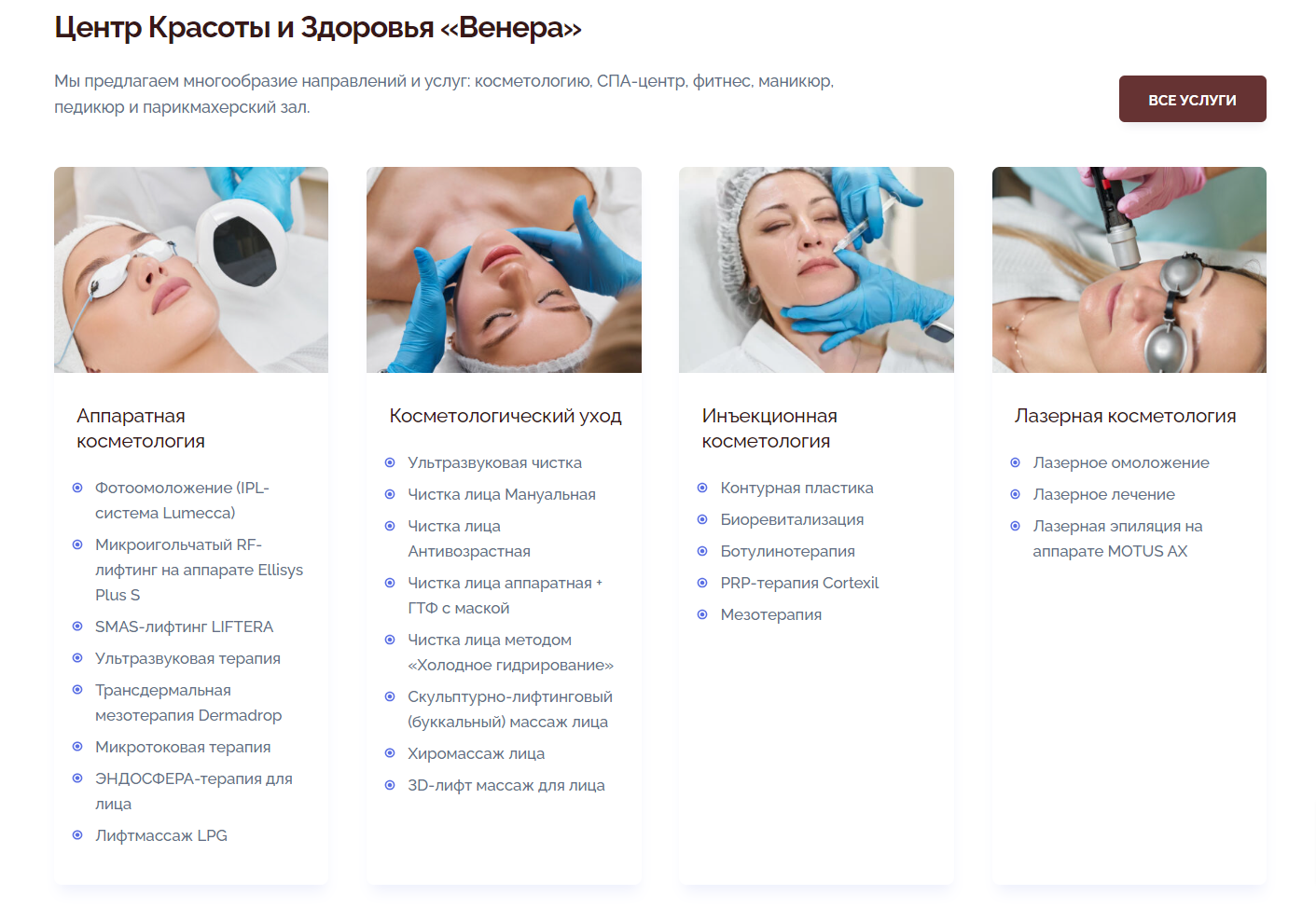 Для удобства пользователей, которые не смогли найти интересующую их процедуру в предыдущем блоке, мы проработали и заполнили следующий блок «Услуги». В данном блоке представлен полный список всех предлагаемых процедур, организованный по разделам.