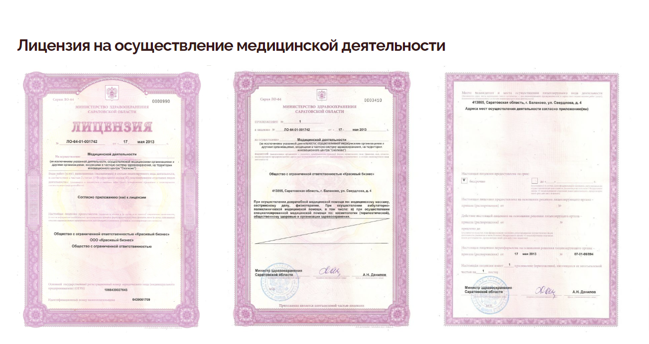 Центр красоты и здоровья «Венера» известен своим профессиональным подходом и гарантированным качеством предлагаемых услуг. Мы постарались всесторонне осветить это на сайте. На главной странице разместили лицензию на осуществление медицинской деятельности, подтверждающую высокие стандарты оказываемых услуг и обеспечивающую доверие клиентов.