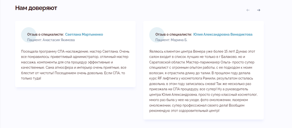 В завершении на главной странице был размещен блок, посвященный отзывам клиентов Центра красоты и здоровья «Венера». Этот блок не только подчеркивает качество предоставляемых услуг, но и повышает уровень доверия потенциальных клиентов.