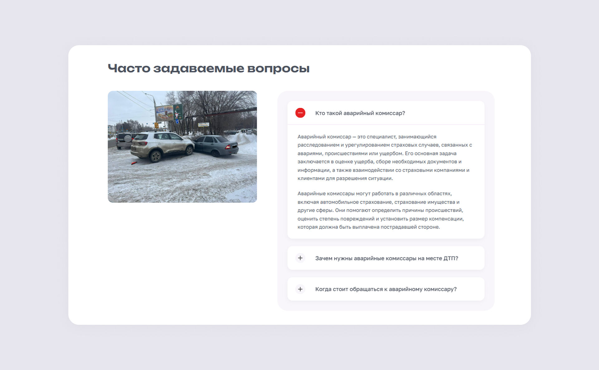 Ниже разместили информативный блок «Кто такой аварийный комиссар», в котором подробно описали его функции и обязанности.
