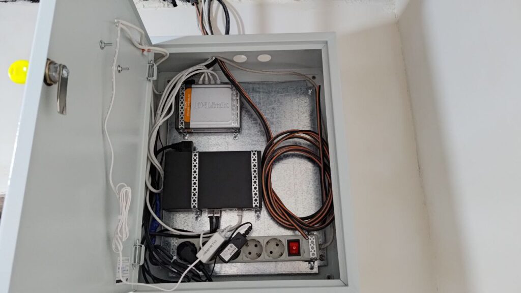 Установили коммуникационный шкаф с оборудованием (роутер, SVB-604PC Коммутатор, Коммутатор D-Link).