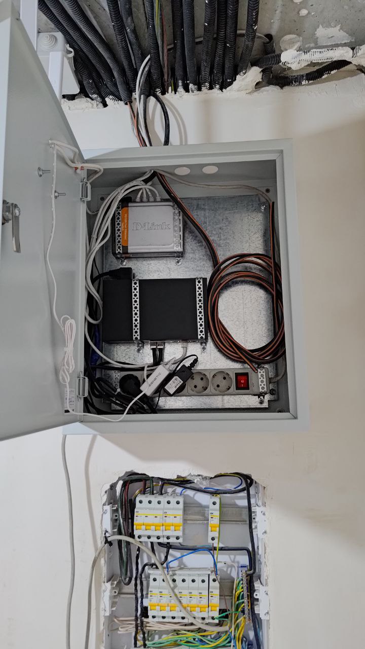 Установили коммуникационный шкаф с оборудованием (роутер, SVB-604PC Коммутатор, Коммутатор D-Link).