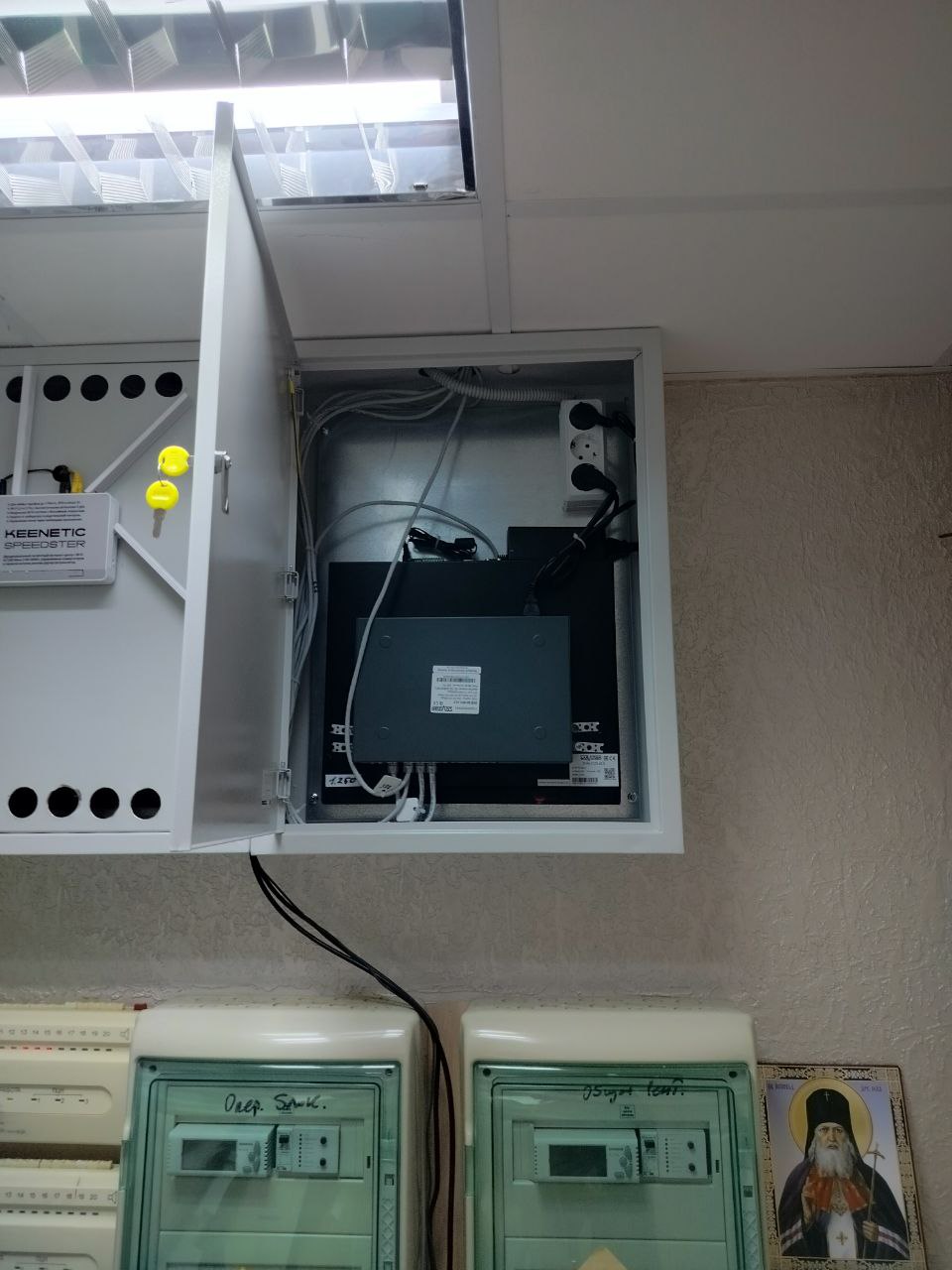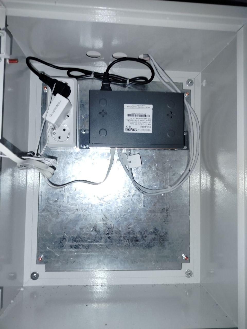 Установка 2 коммуникационных шкафов. Один установлен на первом этаже, где ресепшен. В этом шкафу поставили SVN-6125 v2.0 видеорегистратор сетевой, POE-коммутатор Satvision SVB-608PC. Второй в подвальном помещении. В этом шкафу установили POE-коммутатор Satvision SVB-608PC и роутер Keenetic Speedster — Гигабитный интернет-центр с Mesh Wi-Fi 5 AC1200, 4-портовым Smart-коммутатором и переключателем режима роутер/ретранслятор.