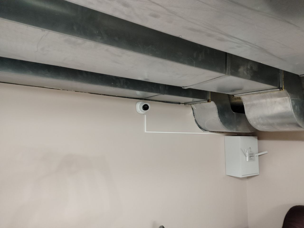Прокладка кабеля DIVISAT UTP 4PR 24AWG Cu CAT 5e (0,52), PVC (63-01-16-10-T) к камерам. Кабель уложен в кабель-канал, чтобы не портить внешний вид отделки помещения.